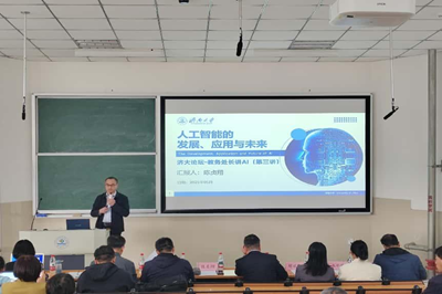 会议第一阶段是专家报告。教务处处长陈贞翔教授以《人工智能的发展、应用与未来》为题做了专题报告。陈处长以深入浅出、幽默风趣的语言和视频,向大家介绍了目前人工智能的发展及应用情况。又系统剖析了PG App