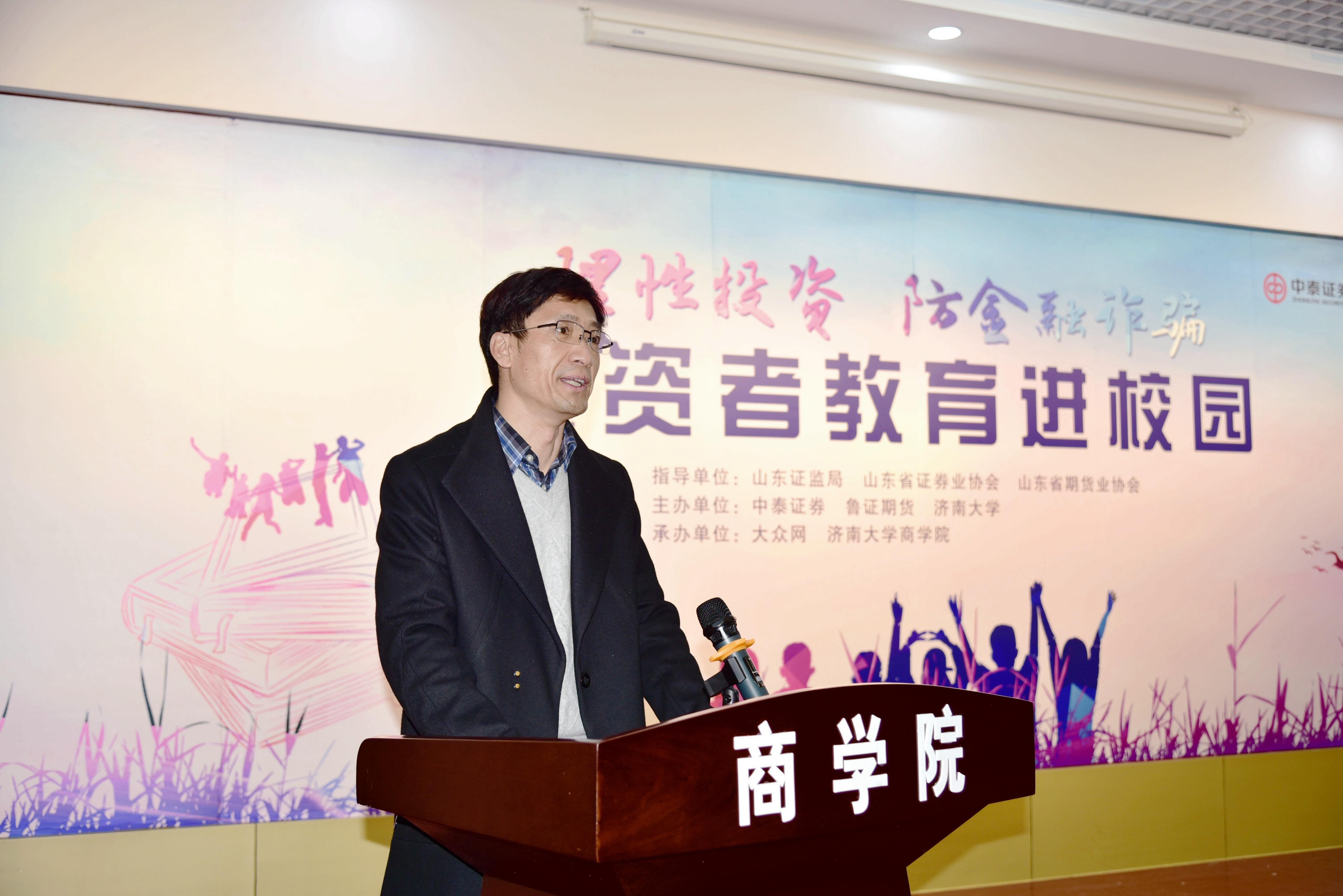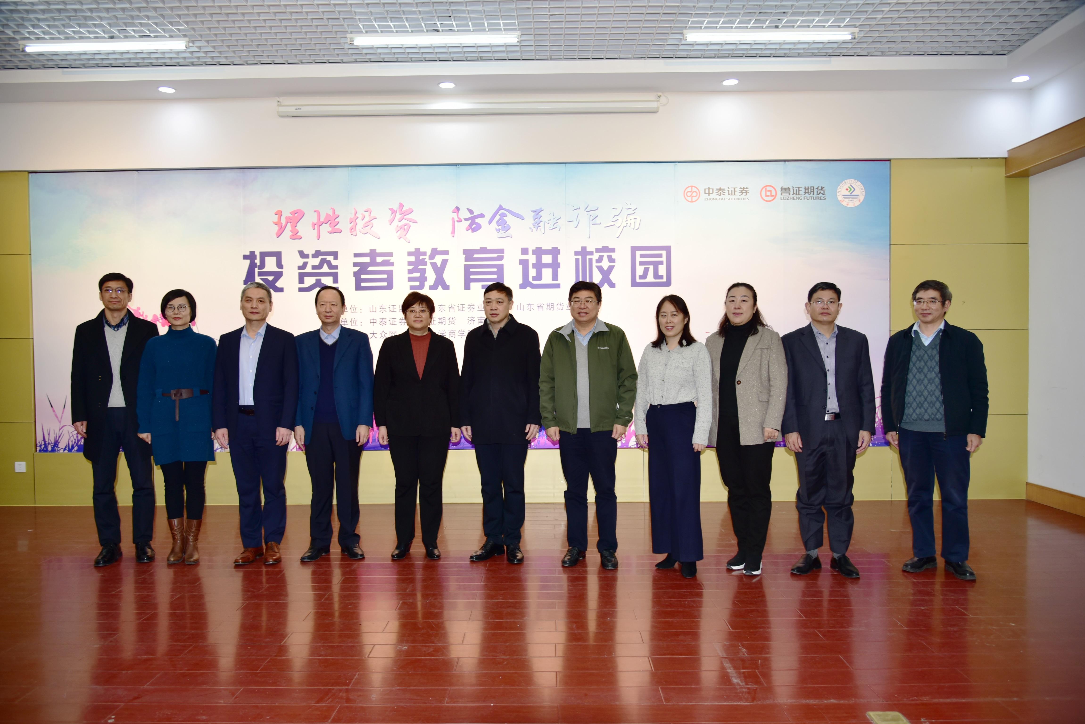 和中泰证券、鲁证期货共同主办的“理性投资 防金融诈骗”投资者教育进校园活动暨共建投教实训基地揭牌仪式在经管楼第一报告厅举行。山东省证监局投保处一级调研员胡文利、山东省期货业协会副会长季秋红、山东省证券业协会秘书长侯成伟、中泰证券经纪业务部副总经理刘心义、鲁证期货副总经理裴剑英、大众网财经部主任周海升、中国建设银行济微路支行行长王绍福,PG App