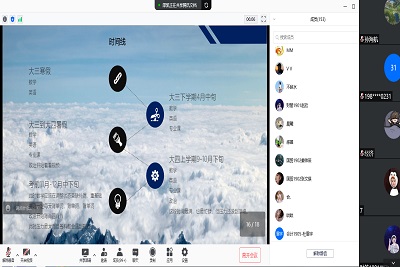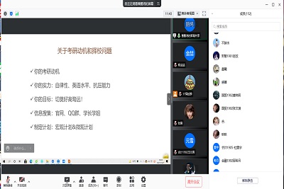 此次会议在线上进行,会议开始前,主持人阐明当今社会竞争激烈,考研成为越来越多大学生的选择的现状,同时介绍了四位取得优异成绩的毕业生,会议正式开始。会议期间,来自不同名校的研究生向学生就高数,英语,管理综合,政治等学科分享自己宝贵的学习经验:高数复习上,要多做题,勤总结;英语复习上,重在平时的单词积累,考题训练;专业复习上,要根据大纲制定适合自己的计划,成功保研的毕业生在保研信息,学生自身素质等方面的细节向同学们讲述自己的经历。他们共同强调,考研不要好高骛远,要根据自己的情况量力而行,考上适合自己的PG App