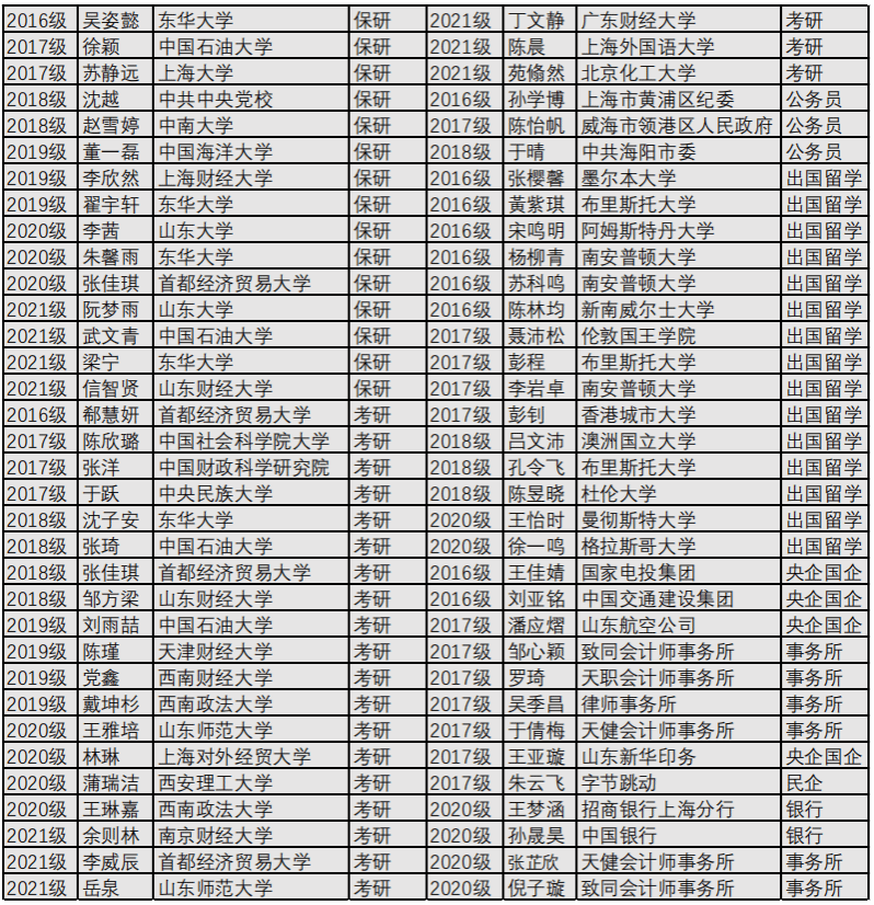 本科生一次就业率在90%以上,主要去向是农行、招商、浦发等金融机构,中国重汽、鲁能集团、蒙牛集团等知名企业和信永中和、瑞华、立信等会计师事务所。近15%的优秀毕业生考取厦门大学、中国人民大学、山东大学、中国海洋大学、东北财经大学、天津财经大学等知名高校的研究生。近10%的毕业生考取财政、税务、人社等部门或系统的公务员。近5%学生到加州大学、纽约大学等国外大学留学。为提高学生“两创”能力,实施“一生一赛”措施,鼓励大学生参加各类大赛,近三年获得省级以上科技创新竞赛奖80余项,其中CIMA全球商业精英挑战赛(GBC)华东区域决赛冠军,全国“挑战杯”创业计划大赛铜奖1项、全国大学生会计信息化技能大赛全国一等奖2项。