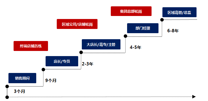 2) 三年内零售终端基层培养,其中包括:店铺销售精英—店长—区域主管;