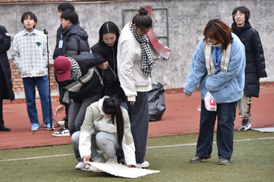 经过短暂的休息时光,我们的“听声辩位”游戏环节开始啦。各参赛选手蒙住双眼,在室友的声音指挥下小心翼翼却又精准的向前迈步,共襄盛举,尽管有其他小组的声音干扰,但宿舍成员之间的默契与信任让参赛选手成功找到队友完成比赛。