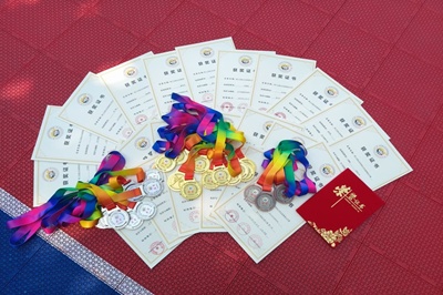 刘广松老师担任教练员,18名参赛选手分别参加了个人竞技、个人品势、混双品势、竞速等项目,他们用精湛的技艺和顽强的斗志,斩获金牌12枚,银牌16枚,铜牌10枚,共计38枚,斩获团体总分第一名。