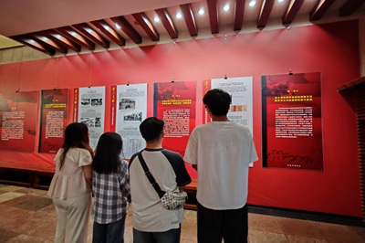 移步至中国共产党党史展区,实践团沿着时间轴系统梳理了党的组织建设历程与波澜壮阔的解放战争。“不尽英豪舒意气,几多儿女献青春。”此情此景令成员们深切体悟到,革命先辈为民族独立和人民解放,甘愿抛头颅、洒热血的坚定信念以及大无畏精神。