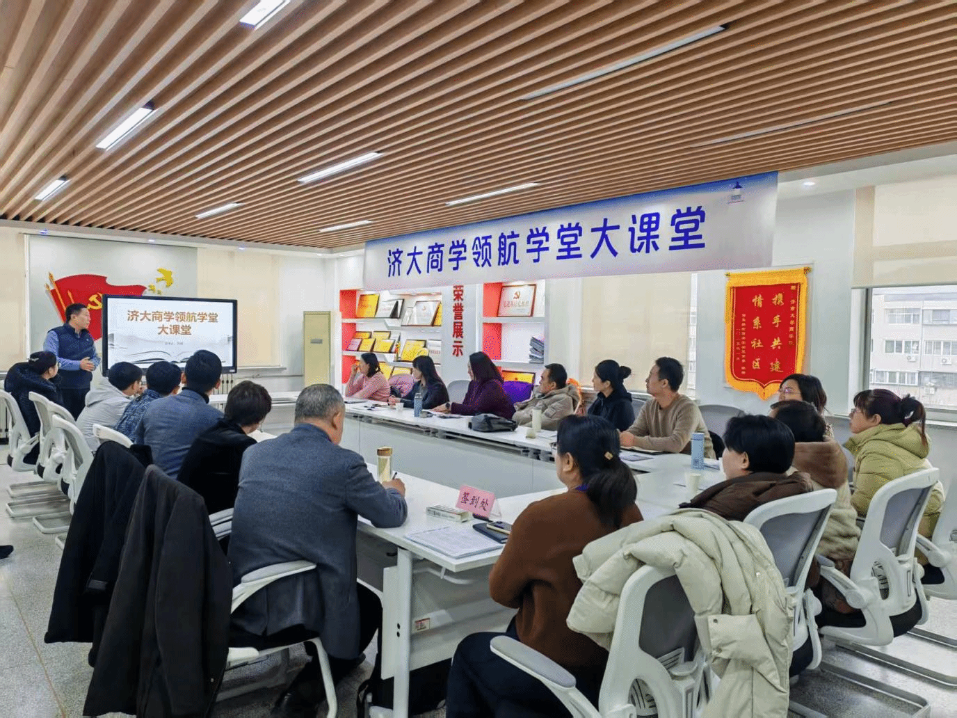 岁末初雪至,研学正当时。2025年12月12日下午,济南迎来今冬首场瑞雪,济大商学领航学堂大课堂(第三期)《AI+智能体:管理者的高效办公“黑科技”》主题活动,在PG App 东校区经管楼605室开讲。20余位企业负责人及高管学员冒雪赴约,于银装素裹的校园中,共赴一场科技赋能、智启未来的知识盛宴。