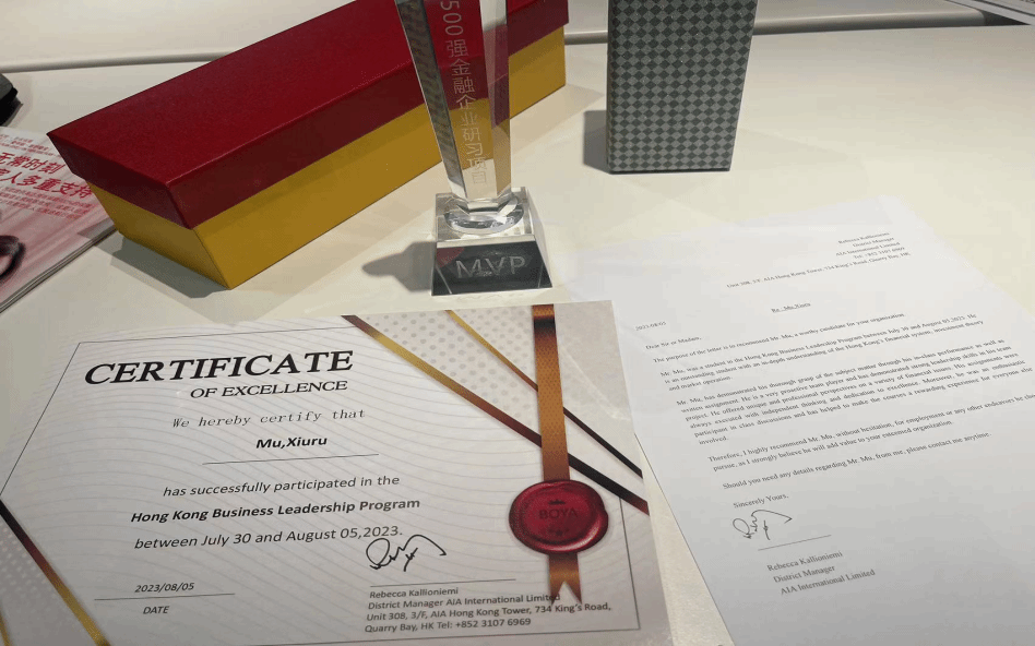 下面是香港AIA金融实训项目MVP奖杯和证书以及国际高管Rebecca的签署推荐信