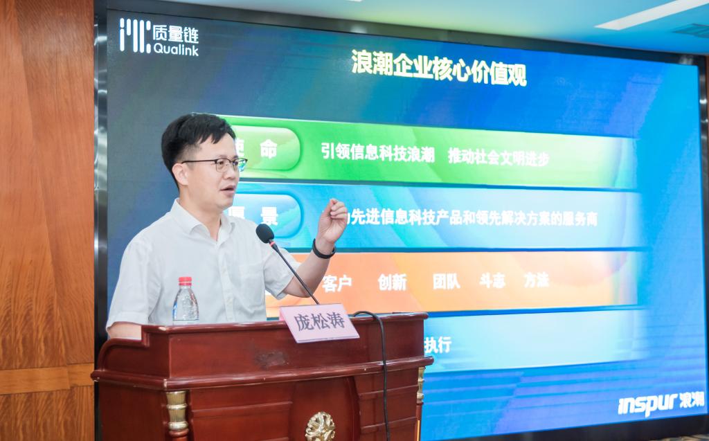 浪潮集团有限公司副总裁庞松涛做了《质量链接数据 驱动企业高质量发展》的主题报告,介绍了浪潮集团四大产业群组以及核心价值观、浪潮云战略3.0。得益于浪潮创新三步曲 “技术-专利-标准”,使得浪潮在关键计算、云服务器、科学计算、AI服务器等方面走在了前列。