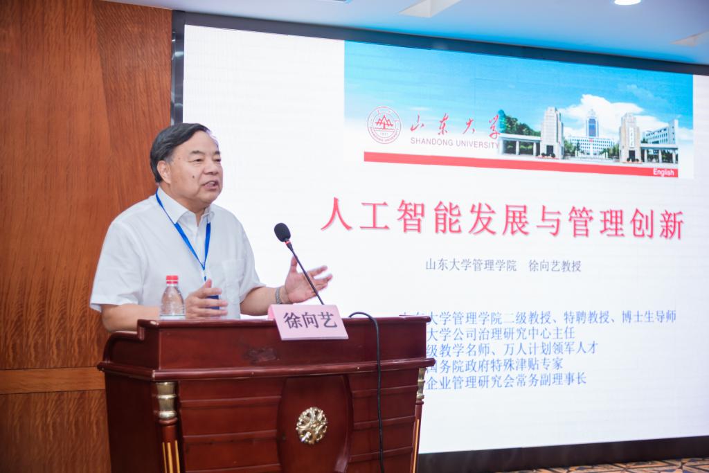 山东大学公司治理研究中心主任、徐向艺教授发表了《人工智能发展与管理创新》主题演讲,他指出人工智能时代的管理具有科学性、艺术性和技术性。以智能机器人能够充当的4种职能角色为切入,提出人工智能时代产生新型“管理者”与新型“智能员工”。